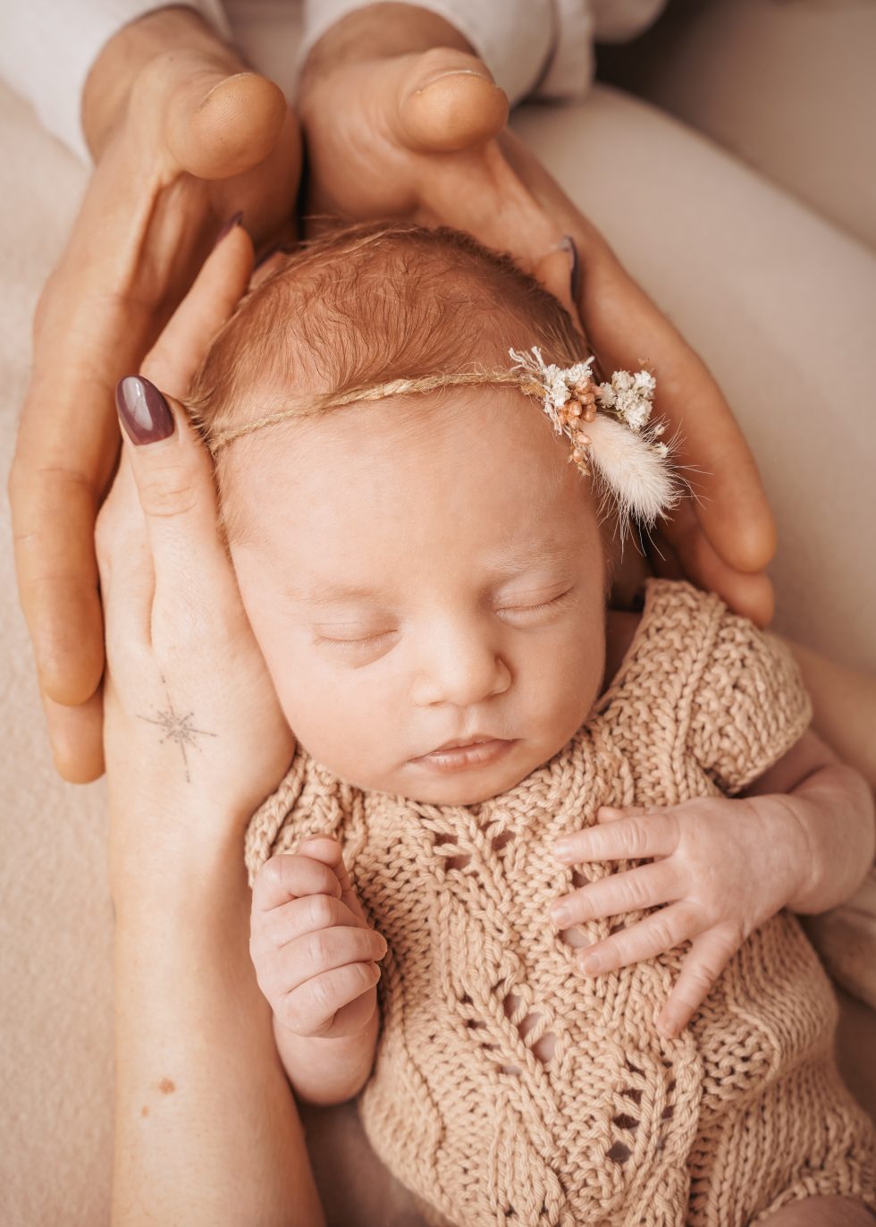 Das Fotoshooting findet im Idealfall in den ersten 10 Lebenstagen eures Babys statt, da sie in dieser Zeit noch sehr viel schlafen. Wir planen für das Fotoshooting genügend Zeit ein und sprechen bereits vorher darüber, wie ihr euch die Fotos vorstellt, damit euer Baby keinen Stress verspürt und friedlich im kuscheligen Fotoaufbau liegen und schlafen kann. Ich habe unter anderem eine Auswahl an Tüchern, Haarbändern, Mützchen, Körben sowie verschiedenen Fotohintergründe, die für das Fotoshooting genutzt werden können.